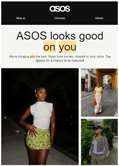 Here’s a great example of user-generated photo content in an email marketing campaign from online retail giant ASOS: